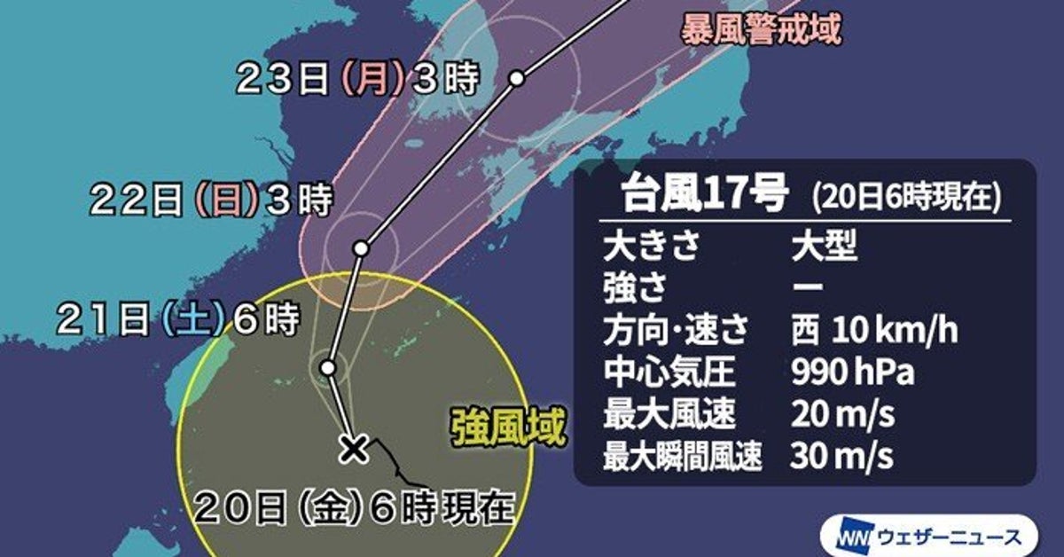 大型の台風17号 沖縄接近 21日 土 は西日本で雨強まる ウェザーニュース