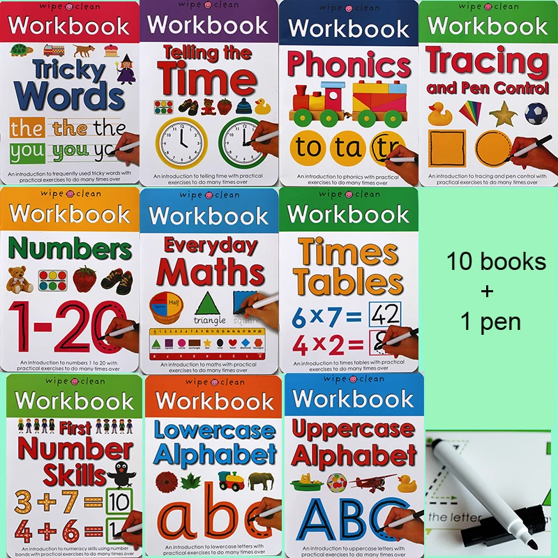10 Books Set Wipe Clean Workbook Pen Children English Picture Book Times Tables Maths Number Skill Tricky Words Abc Picture Book Book Setenglish Workbook Aliexpress